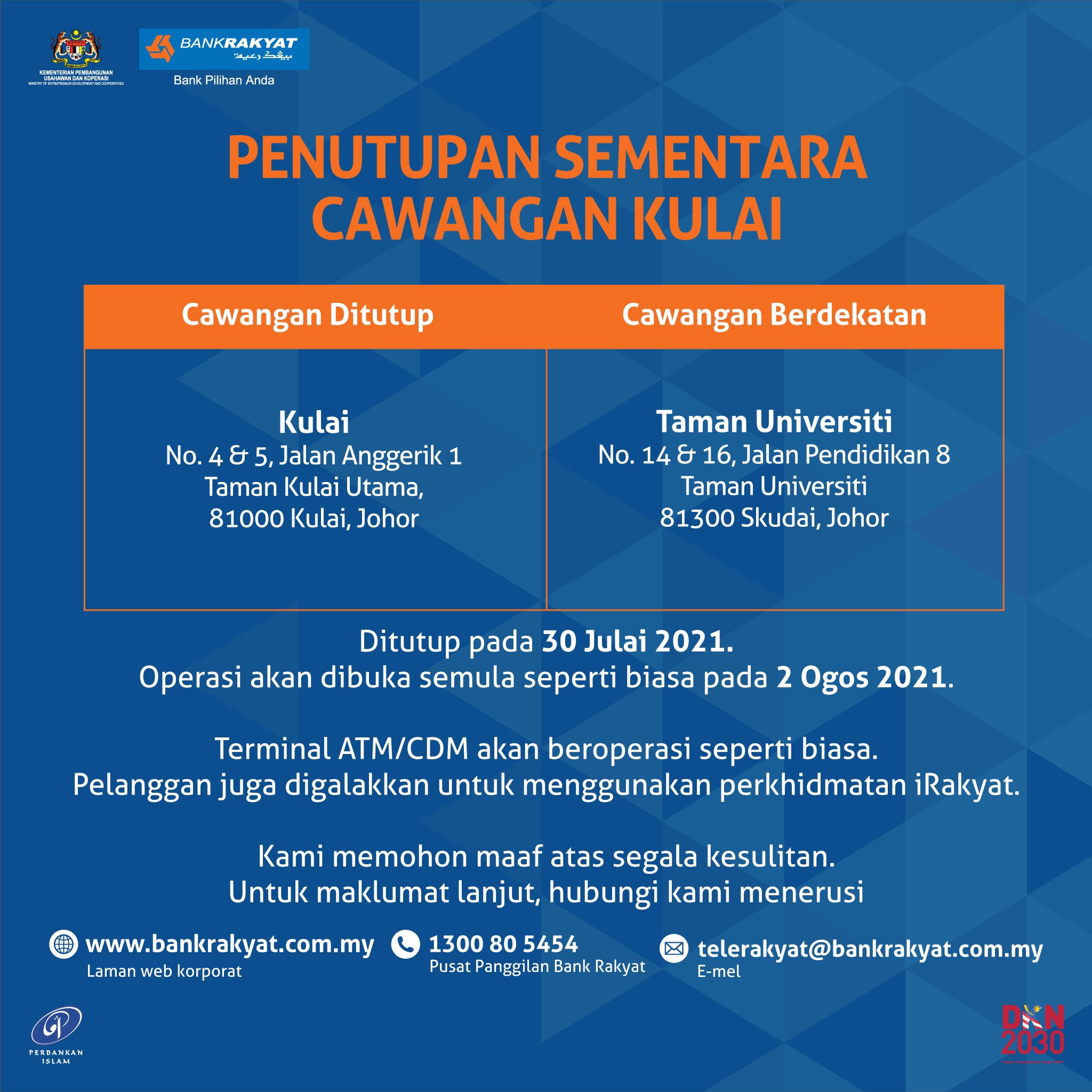 Bank Rakyat On Twitter Pelanggan Yang Dihargai Sila Ambil Maklum Berkaitan Penutupan Sementara Cawangan Kulai Pada 30 Julai 2021 Operasi Akan Dibuka Semula Pada 2 Ogos 2021 Seperti Yang Dinyatakan Bankpilihananda Bankrakyat25