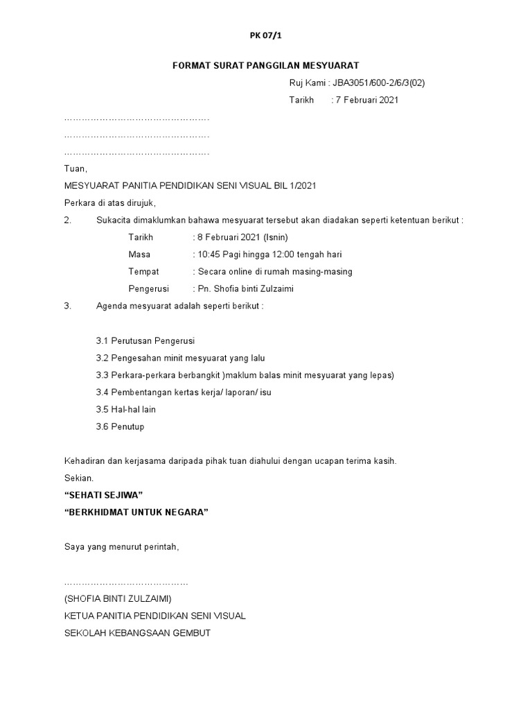 Contoh surat panggilan mesyuarat kerajaan contoh surat. Surat panggilan mesyuarat panitia kali pertama. Up to 3 cash back Save Save Pk07-1 Format Surat Panggilan Mesyuarat Plc 1 2018 For Later.